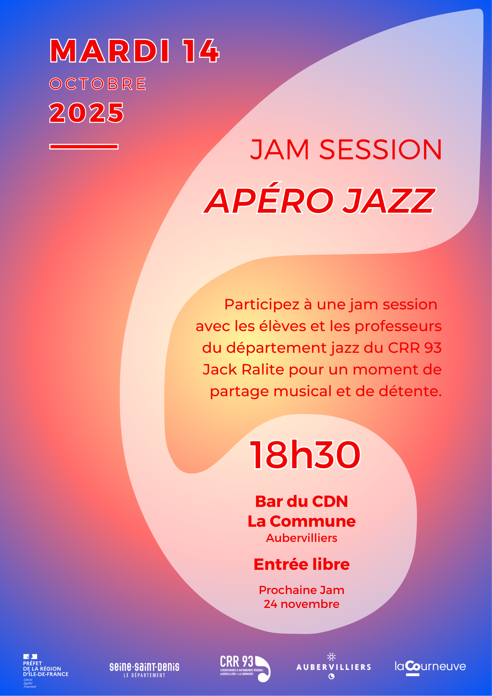 Mardi 14 Octobre 2025 Bar du Théâtre de la Commune 2 rue Edouard Poisson, 93300 Aubervilliers 18h30 ● Tarifs : Entrée libre et gratuiteAmbiance conviviale garantie au bar du théâtre de La Commune pour une jam session jazz ouverte à toutes et tous !