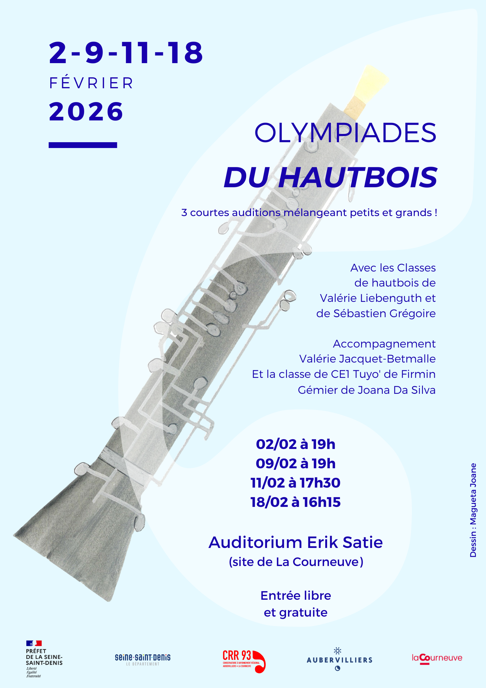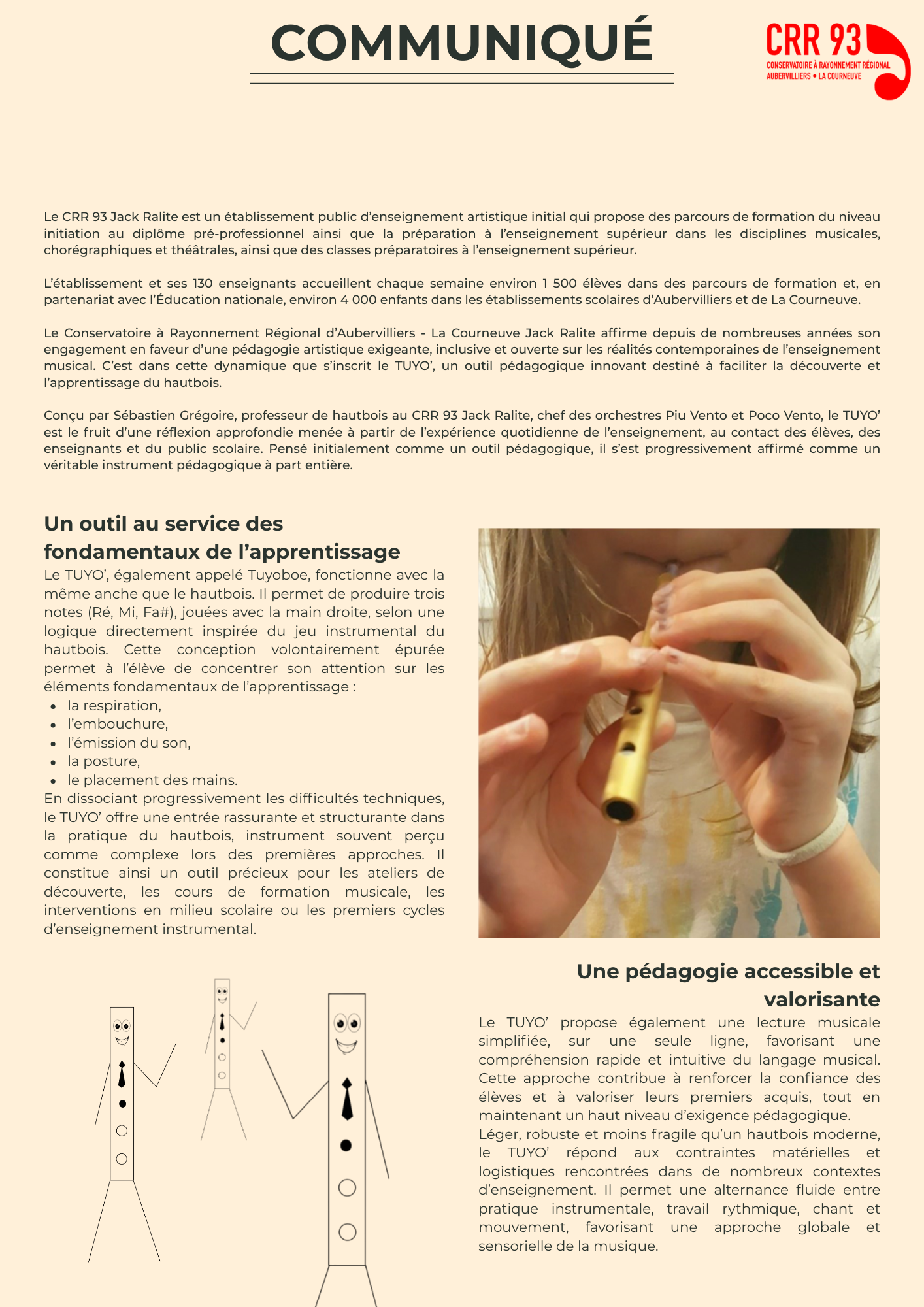 Découvrez également les Olympiades du Hautbois, une série de quatre auditions mêlant jeunes élèves et musiciens plus avancés, dans un esprit de partage et de transmission. Porté par les classes de hautbois de Valérie Liebenguth et Sébastien Grégoire, avec l’accompagnement de Valérie Jacquet-Betmalle et la participation de la classe de CE1 Tuyo’, cet événement se déroulera à l’Auditorium Erik Satie (La Courneuve, plus d'infos ci-dessous). Vous pouvez également retouver notre communiqué sur le Tuyo' un outil pédagogique pour l'apprentissage du hautbois