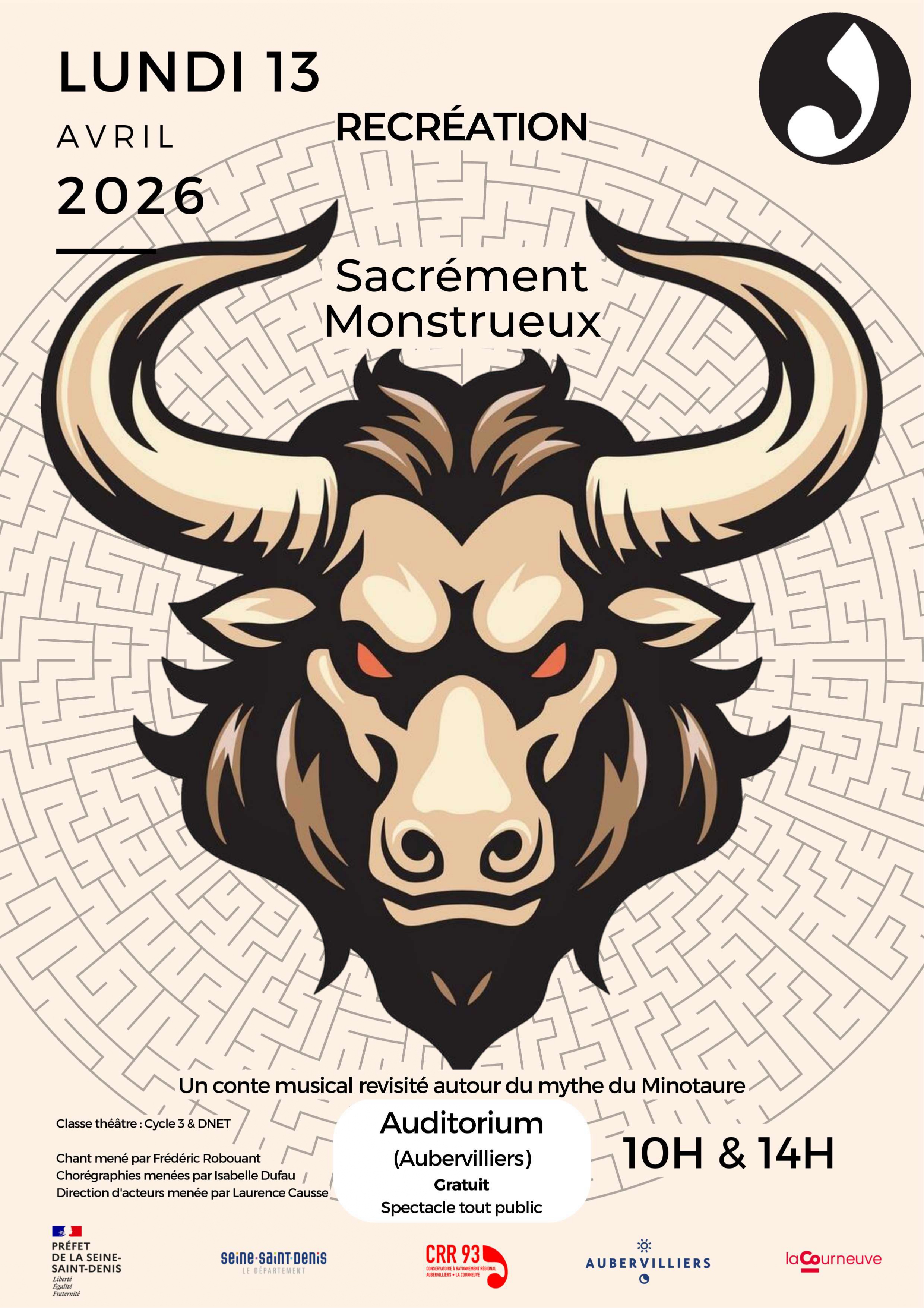 Lundi 13 Avril 2026 Auditorium 5 rue Edouard Poisson, 93300 Aubervilliers 14h00 ● Tarifs : Entrée libre et gratuiteEn se basant sur le conte musical Le Minotaure, les élèves Cycle 3 & DNET théâtre proposent une adaptation transdisciplinaire. Venez découvrir le mythe du Minotaure et son labyrinthe, en suivant les aventures d'Egée, Minos, Thésée et Ariane... Chants, chorégraphies et théâtre seront au rendez-vous ! Spectacle à partir de 9 ans.
