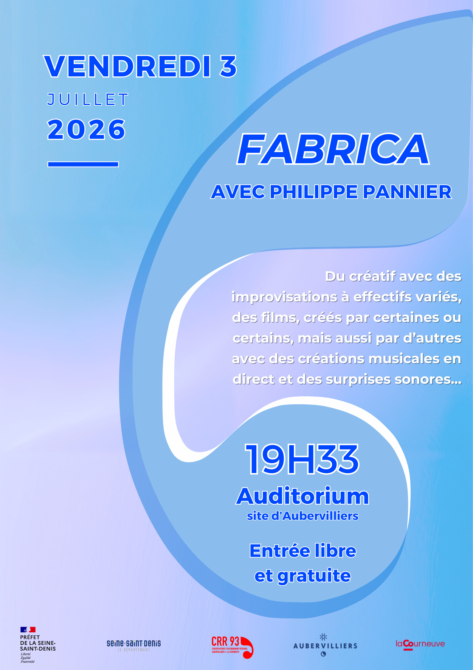 Saison artistique ♦ ♦ FABRICA Vendredi 03 Juillet 2026 Auditorium 5 rue Edouard Poisson, 93300 Aubervilliuer 19h33 ● Tarifs : Entrée libre et gratuite La classe d’improvisation de Philippe Pannier vous convie à une performance unique au sein de l’auditorium. [...]